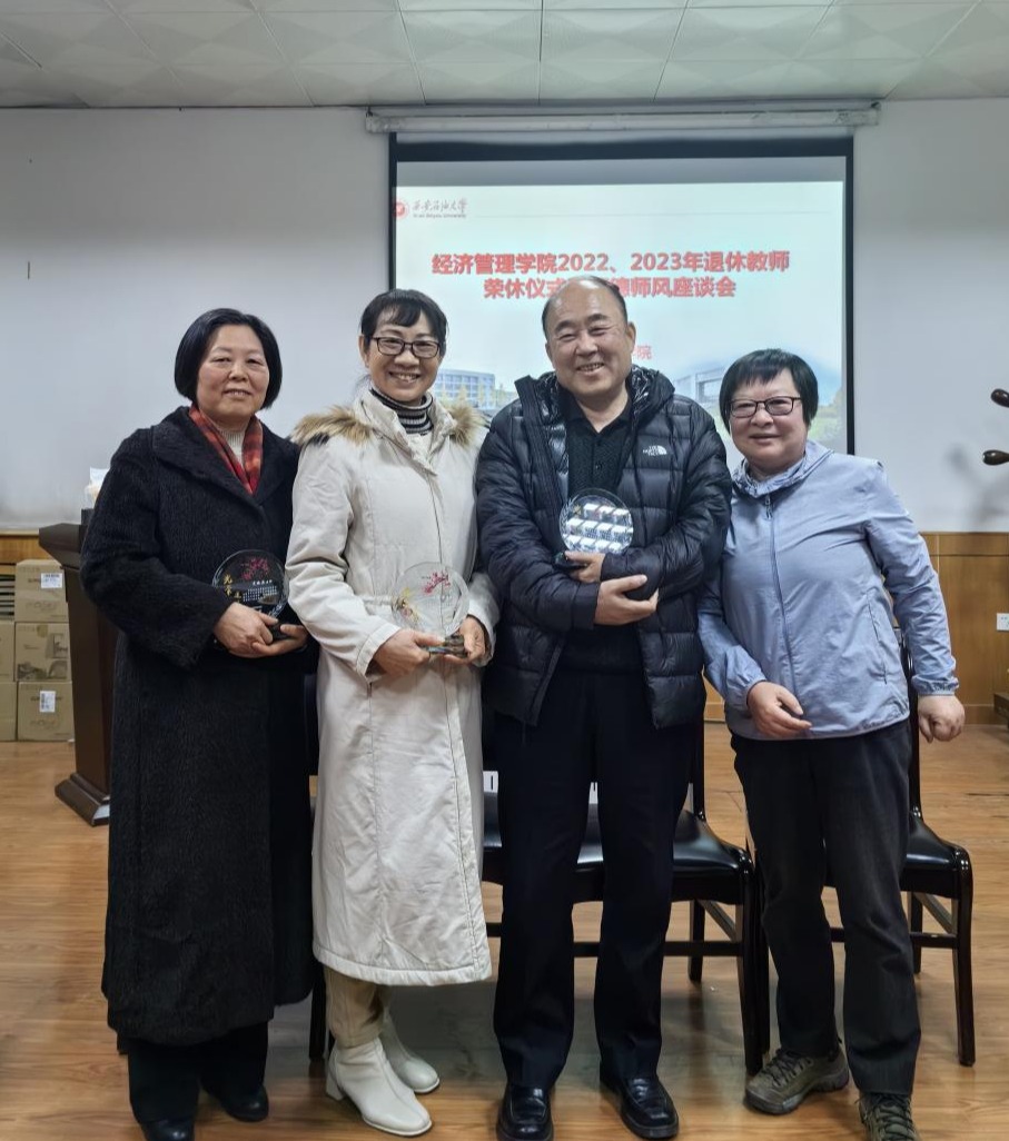 4位荣休教师回顾了30余年来工作的点点滴滴,分享了学习、工作、生活上的深切体会,有时光荏苒的感慨、有贡献学校、学院事业发展成就的自豪、有坚守三尺讲台育人育才的荣耀、有见证青年教师成长的欣慰、有珍惜师生同事深厚情谊的挚言。他们纷纷表示,将一如既往地关心支持学院未来发展,义不容辞献出自己的一份力量。经济管理学院党委书记王宏卫代表学院感谢各位老师为学院教育事业的倾心付出,肯定了各位老师为学院发展做出的突出贡献。院长王君萍宣读了荣休教师名单和退休通知单。与会青年教师代表作了交流发言。