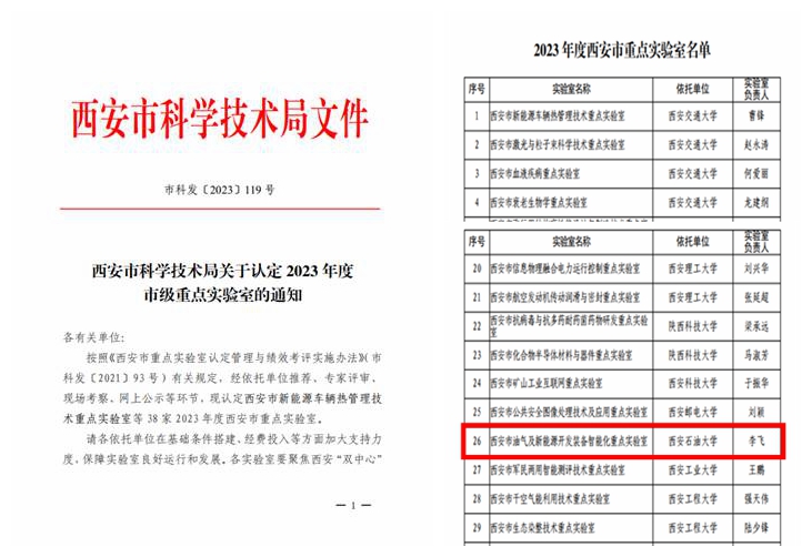 近日,西安市科技局发布《西安市科学技术局关于认定2023年度市级重点实验室的通知》,bat365电子工程学院李飞教授牵头的“西安市油气及新能源开发装备智能化重点实验室”通过认定,本次共38家实验室通过认定。