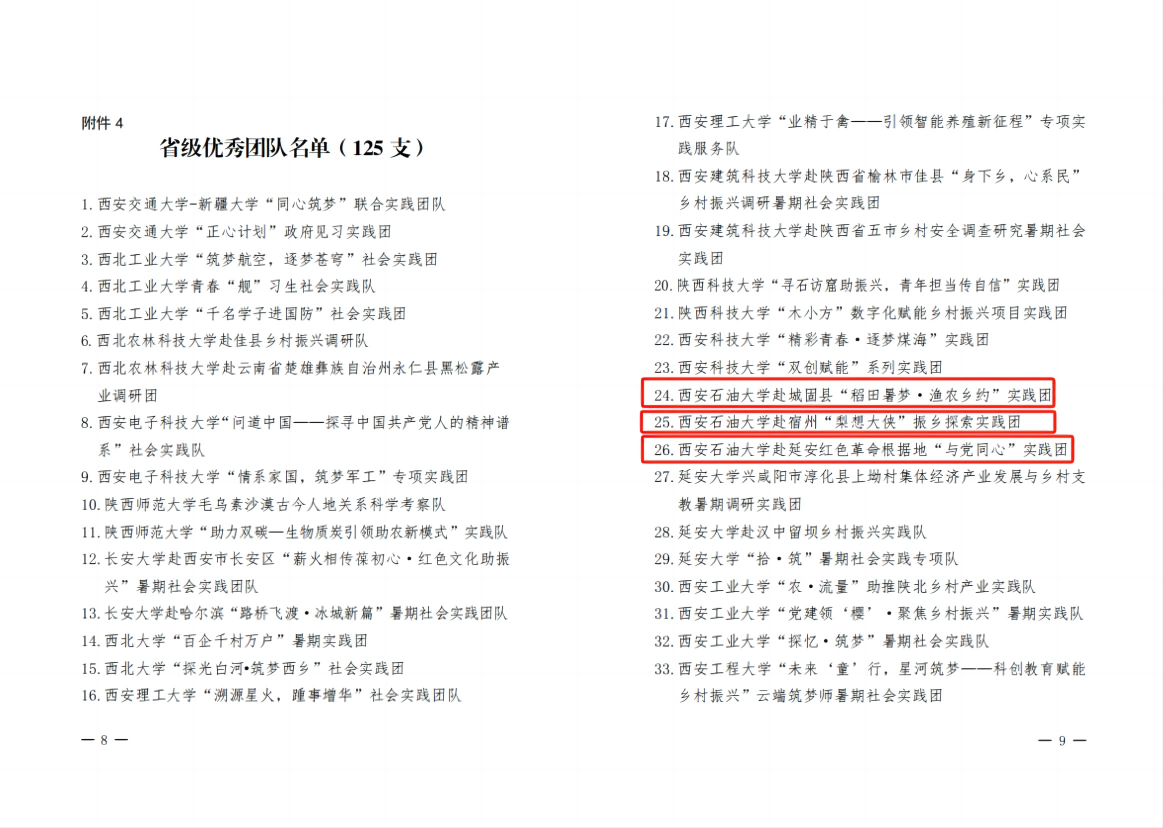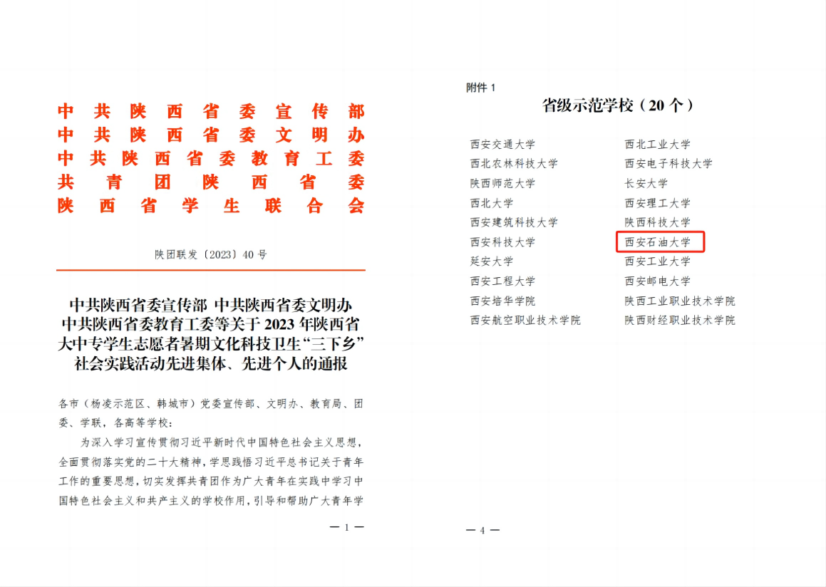 近日,由陕西省委宣传部、省委文明办、省委教育工委、团省委、省学联等单位联合组织开展的“2023年陕西省大中专学生志愿者暑期文化科技卫生‘三下乡’社会实践活动”评选表彰结果揭晓,bat365荣获2023年“三下乡”活动省级示范学校,地球科学与工程学院“赴城固县‘稻田暑梦·渔农乡约’实践团”、经济管理学院“赴宿州‘梨想大侠’振乡探索实践团”、石油工程学院赴“延安红色革命根据地‘与党同心’实践团”被评为省级优秀团队。王泽文、宋亚文、刘宇航被评为省级先进个人。经济管理学院《数商兴农背景下农村电商发展影响因素及优化策略调研报告》被评为省级优秀调研报告,并获团省委专项资助。