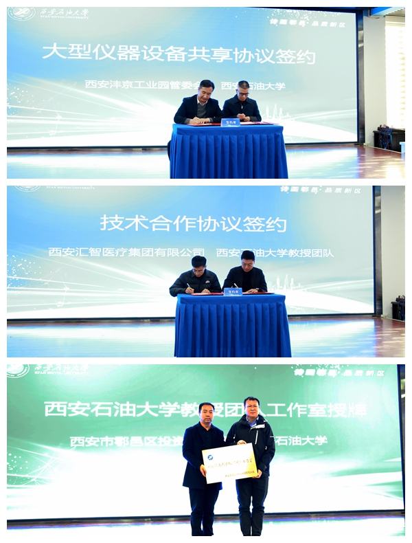 期间,实验室管理处负责人代表学校与沣京工业园签订大型仪器设备开放共享协议;化学化工学院杨博老师团队与西安汇智医疗集团有限公司签订技术合作意向协议;科技处负责人代表学校接受沣京工业园管委会颁发的bat365中文官方网站教授团队工作室牌匾。
