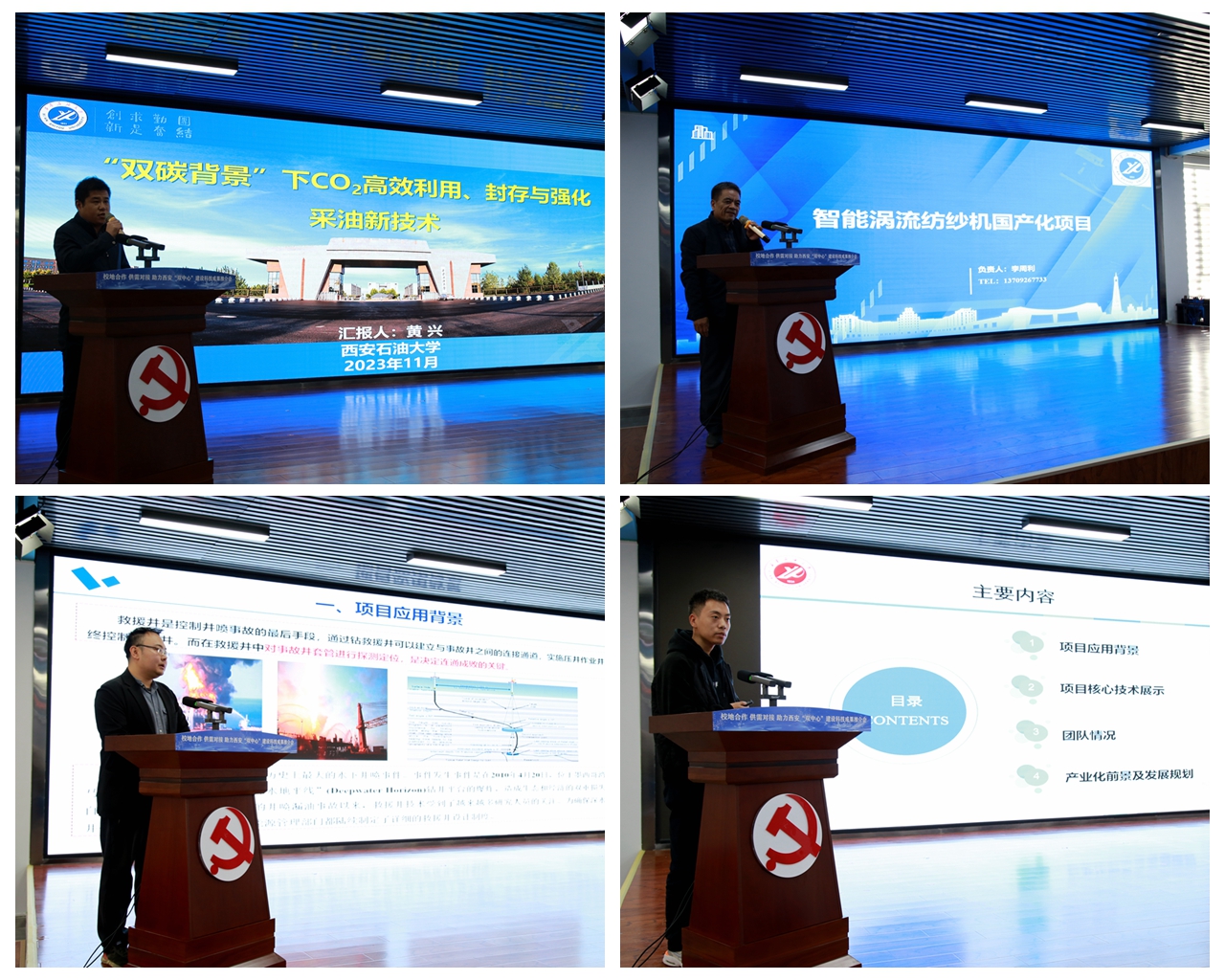 会议期间,沣京工业园管委会党工委书记王鹏涛介绍了bat365中文官方网站科技成果转化基地的服务保障政策,为科研团队成果转化落地提供良好的创业环境。石油工程学院黄兴教授,电子工程学院李周利教授、党博教授以及材料科学与工程学院翟文彦博士结合多年科技攻关和技术沉淀,分别就“双碳背景”下二氧化碳高效利用、封存与强化采油新技术,智能涡流纺纱机国产化,特种定向井电磁探测定位技术,先进抗磨耐蚀复合材料技术等展示和推介。