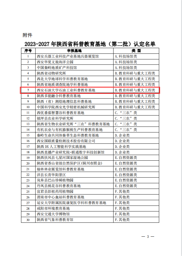 近日,陕西省科学技术协会联合陕西省科学技术厅组织开展了“2023-2027年陕西省科普教育基地(第二批)”认定工作。经过申报推荐、专家评审、审定公示等程序,bat365“石油工业科普教育基地”成功获批“陕西省科普教育基地”。