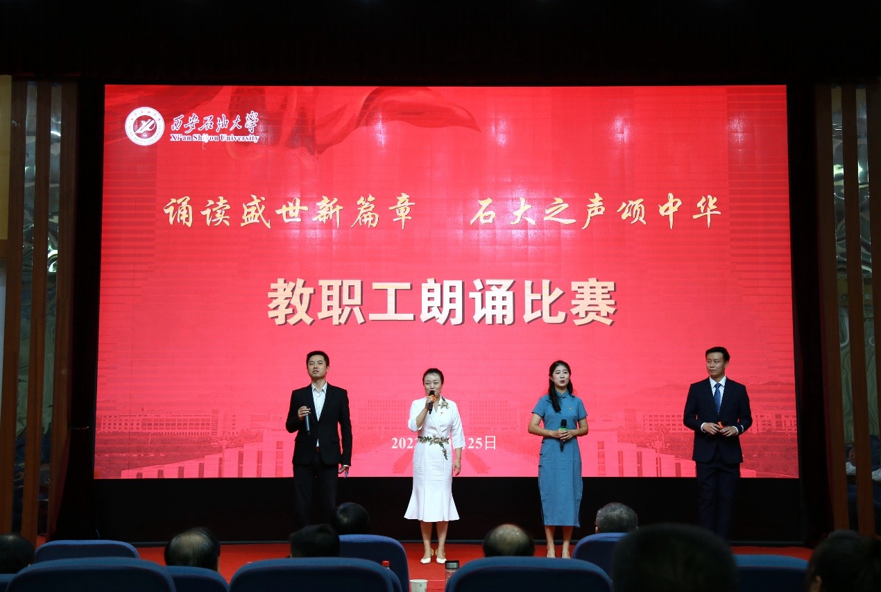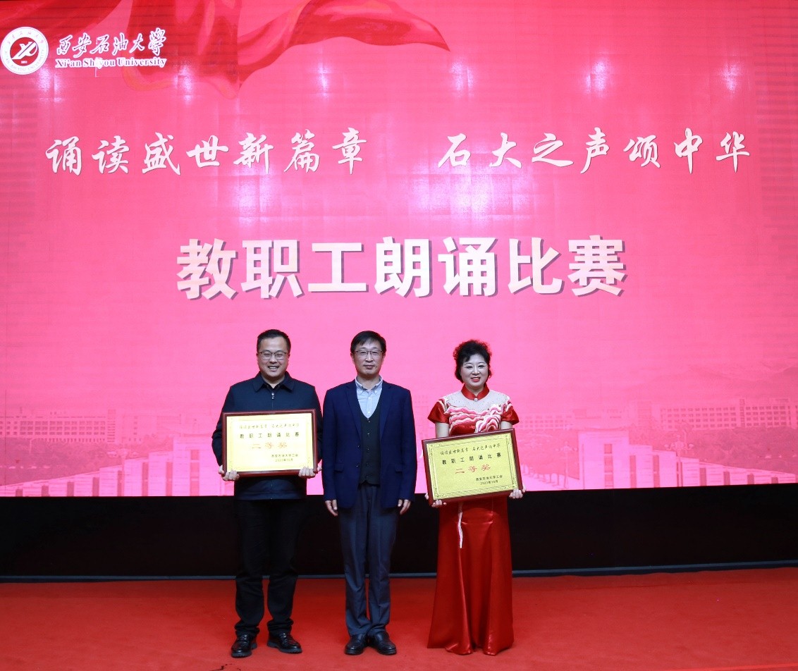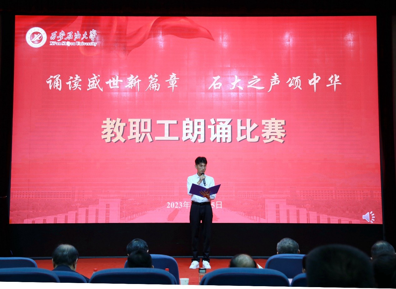 比赛在教职工舞蹈协会的开场舞《我愿全速奔向你》中拉开序幕。参赛选手或个人或集体表演,《奋进新时代,筑梦新征程》《巍巍中华》《你好,新时代》《石油之歌献祖国》《我和我的祖国》《伟大复兴》《大写的中国》《祖国啊,我为你自豪》的参赛选手们铿锵有力,都以饱满的热情倾诉着对祖国的绵绵深情;《贺百年盛会谱东方华章—传承铁人精神踔厉奋进电工院》《筑梦新时代》《密码》《中华少年》《以时代之眼,我们这样看中国》《石油之歌》《唱响新时代》的朗诵者们声情并茂、慷慨激昂地表达永远跟党走的坚定信念;《有那么一群人》《党旗飘飘》《党的二十大之歌》《浓墨重彩绘新世》《我的南方和北方》《回答》《百年芳华》的选手们真情流露,字字婉转却直抵人心。参赛选手把对党和祖国的感情表达得淋漓尽致,展示了西石大人凝心聚力、砥砺前行的精神风貌。比赛在由参赛选手带来的《我和我的祖国》歌声中落下帷幕。最终经济管理学院工会荣获一等奖,化学化工学院工会、电子工程学院工会荣获二等奖,人文学院工会、马克思主义学院工会、机关一工会荣获三等奖。经济管理学院工会、电子工程学院工会、音乐系工会、机关五工会、理学院工会、机关六工会获得本次比赛的优秀组织奖,12个参赛单位获得优胜奖。常江、苏文甫分别为荣获一等奖和二等奖的单位颁奖。