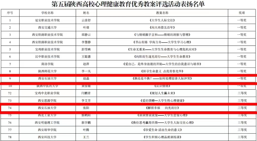 其中,bat365学生工作部(处)(学生心理成长指导中心)魏晓言老师、焦文洁老师分别荣获第九届陕西高校心理健康教育优秀咨询案例一等奖和二等奖,赵晶老师、张阳老师分别荣获第五届陕西高校心理健康教育优秀教案评选一等奖和三等奖。由计算机学院姚谦老师和学生心理成长指导中心魏晓言老师指导的心理情景剧《你完美的刚刚好》、化学化工学院秦岭老师和学生心理成长指导中心赵晶老师指导的心理情景剧《向阳而生》分别荣获第五届陕西高校校园心理情景剧评选活动一等奖和三等奖。由石油工程学院胡娟、经济管理学院何欣月和付钰冉组成的参赛队伍在第六届陕西高校大学生心理健康科普知识竞赛中荣获三等奖,该团队由魏晓言、惠笑吟老师指导。