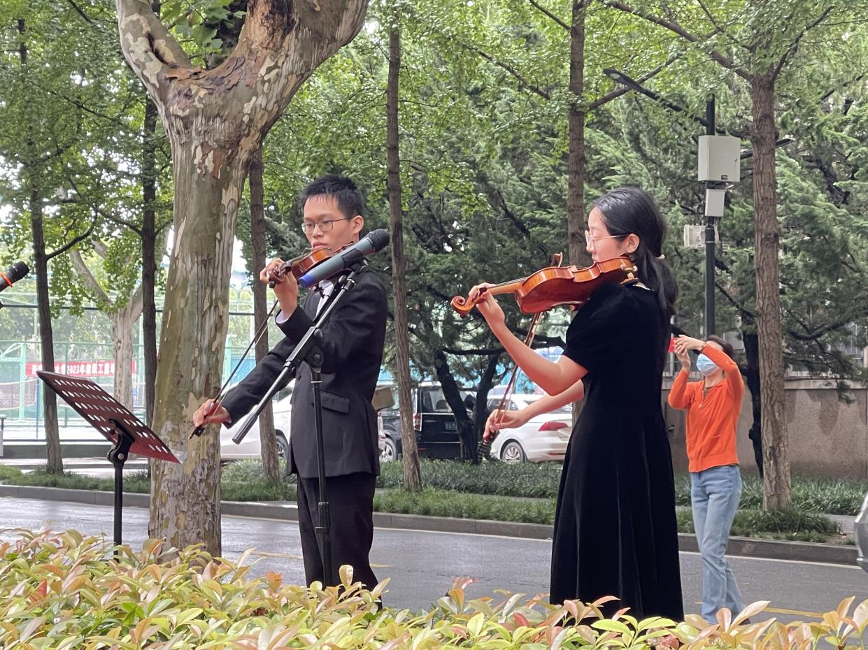 伴随着欢快的音乐声,中午12点10分,参加快闪活动的学生们从四处聚拢到餐厅前,首先以合奏的形式演绎了《我和我的祖国》,在优美的旋律中,学生饱含深情地演唱了《万江》《小白杨》《大红公鸡毛腿腿》《欢聚一堂》,用歌声致敬伟大的党、伟大的祖国和伟大的时代,用饱满的热情、嘹亮的歌声、铿锵的节拍抒发自身的报国之志。最后师生集体合唱了校歌《辉煌明天》,用歌声抒发心中爱国热忱,用镜头向祖国母亲告白。活动在师生们“祝祖国母亲生日快乐”的欢呼声中圆满结束。