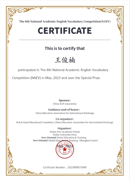 外国语学院组织bat3651172名学生参赛(本科生1032人,研究生140人)。经过三轮比拼,bat365学生王俊楠从一万七千名参赛者中脱颖而出,获全国特等奖,摘得“学术英语词汇之星”!这是外国语学院自2021年组织bat365学生参加该竞赛以来的重大突破!
