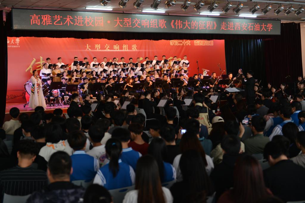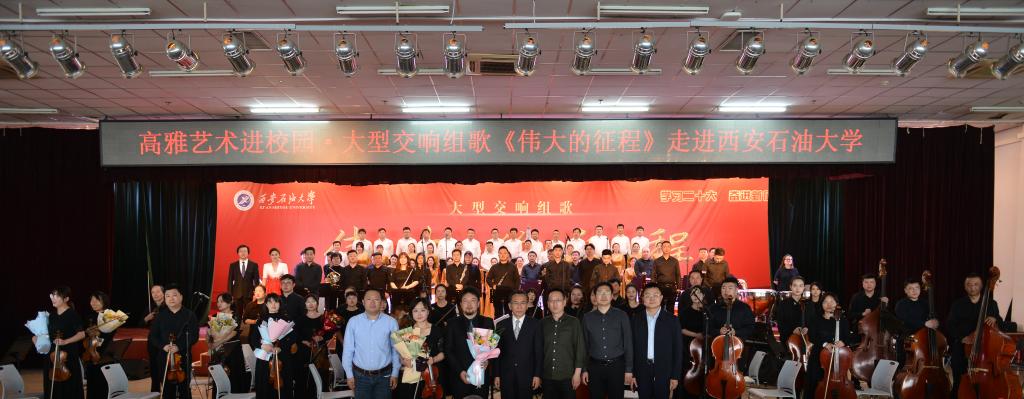 为深入学习贯彻党的二十大精神,加强红色文化宣传,将高雅艺术融入校园建设,切实提高学生人文素养和文化积淀,4月28日下午,由陕西省歌舞剧院有限公司创作的大型交响组歌《伟大的征程》在鄠邑校区腾辉大学生活动中心上演。校党委副书记张木出席活动,学生工作部、校团委负责人,各院(系)辅导员和学生共计800余人观看演出。