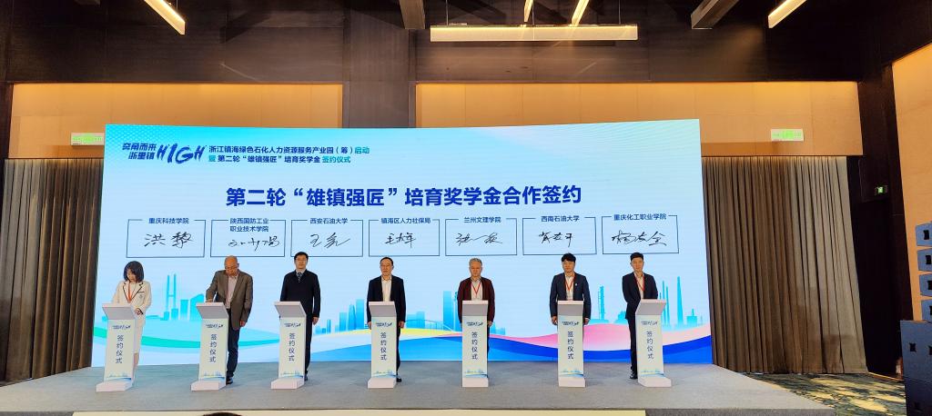 4月25日,bat365受邀参加“奔甬而来·浙里镇High”浙江镇海绿色石化人力资源服务产业园(筹)启动暨第二轮“雄镇强匠”培育奖学金签约仪式。学生工作部(处)部(处)长、就业指导中心主任王亮带队出席并代表学校现场签约。
