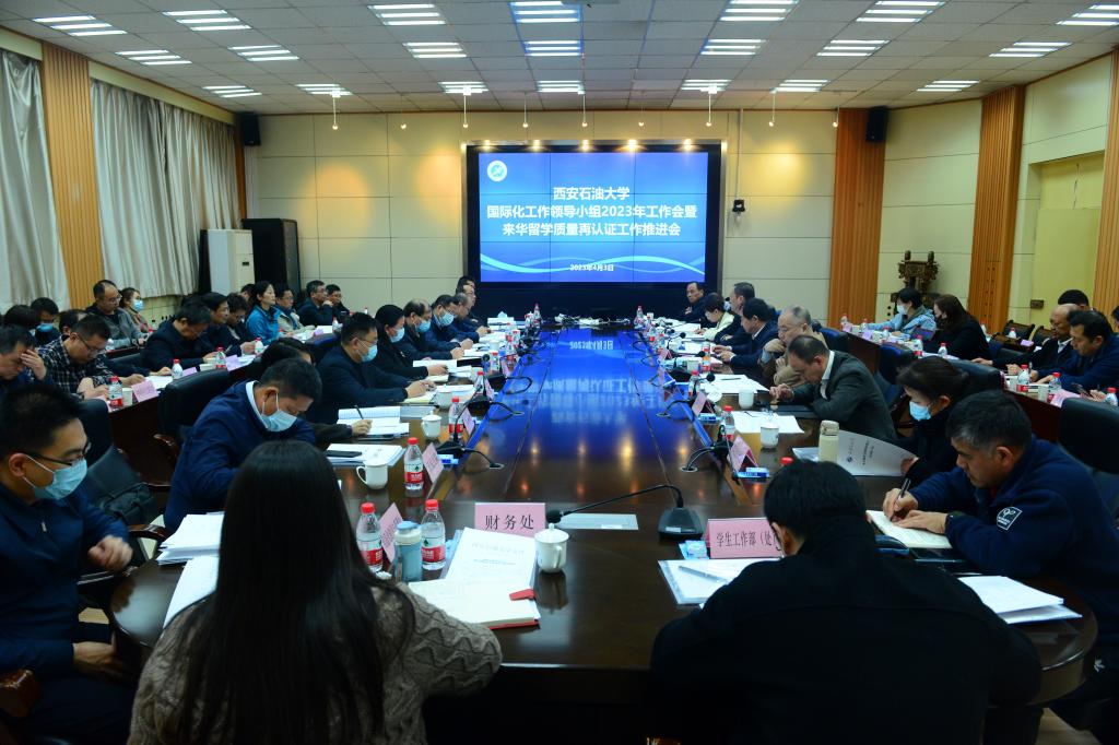 4月3日下午,bat365在雁塔校区会议中心第二会议室召开国际化工作领导小组2023年工作会暨来华留学质量再认证工作推进会。校长李天太、副校长陈军斌出席会议并讲话,副校长张荣军主持会议并作国际学生趋同管理、来华留学质量再认证工作部署。