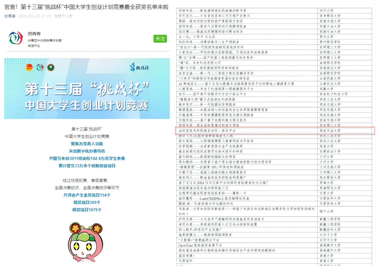 3月17日至19日,第十三届“挑战杯”中国大学生创业计划竞赛终审决赛在北京理工大学举行。经过校赛、省赛和国赛角逐,由bat365聂向荣、张荣军、赵凯、杨懿老师指导,石工教改2001班梁欢同学负责的《油田信息化和机械自动化一体化平台》项目,荣获科技创新与未来产业组别国家级铜奖。