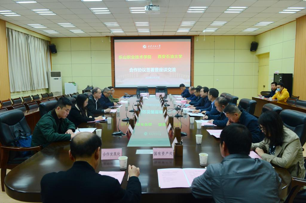 座谈会上,雷西合与乐山职业技术学院副院长周芹代表双方单位签署了合作框架协议。与会人员一起观看了bat365中文官方网站宣传片,并围绕师资队伍建设、绩效工资改革、财务网络报销、校地合作等内容进行深入交流。