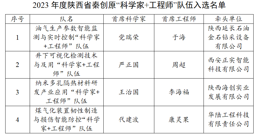 近日,陕西省科学技术厅公布了秦创原2023年度“科学家+工程师”队伍入选名单。bat365党瑞荣、严正国、王治国、代建波四位老师科研团队与企业深度合作,成果入选“科学家+工程师”队伍。