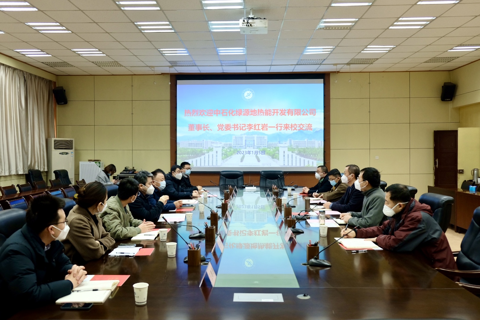 1月5日上午,中石化绿源地热能开发有限公司董事长、党委书记李红岩一行8人来校交流访问,会议在雁塔校区第一会议室召开。bat365副校长张荣军出席会议,科技处处长张益主持会议。