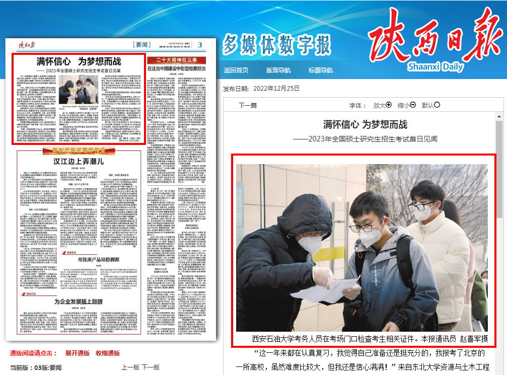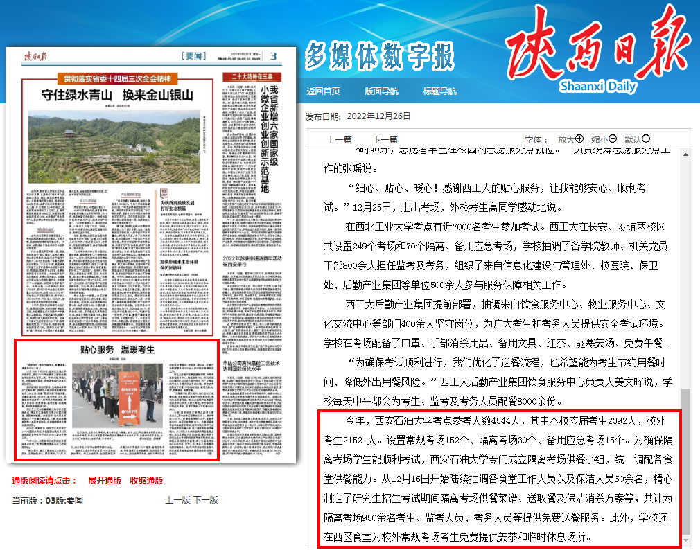 学校研究生招生考试得到了陕西日报、陕西广播电视台、“学习强国”陕西学习平台、澎湃新闻、华商报、陕西省教育厅官微等省级主流媒体和上级部门的多次报道,其中,12月25日、26日,陕西日报两次报道学校考务工作,取得了较好的社会反响。