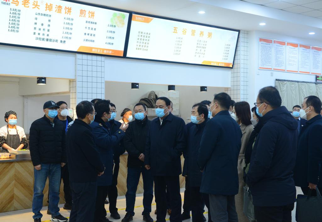 吕来升一行来到鄠邑校区,认真听取了相关负责人对于学校疫情防控措施落实情况和食品安全工作的汇报,并在学生餐厅询问了《企业落实食品安全主体责任监督管理规定》要求的学校食品安全总监、食堂食品安全员的配置情况。