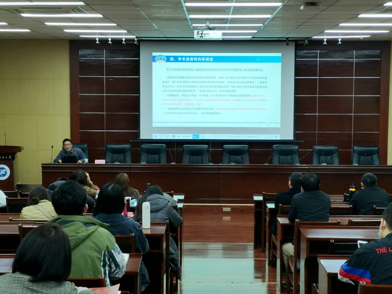 丁昌峰从科技处工作职责及机构设置讲起,对科技管理体制改革情况、如何做好项目申报工作、学术道德与科研诚信三个方面做了详细讲解。他解读了近年来国家及有关部委出台的有关文件和学校科研相关制度,阐述了国家科技管理体制改革情况,为新入职教师分析、讲解了不同层次不同类别的项目申报要求和申请书撰写注意事项。结合《关于全面深化新时代教师队伍建设改革的意见》《关于进一步加强科研诚信建设的若干意见》等文件和近年来国家自然科学基金委员会通报的学术不端案例,丁昌峰就学术道德和科研诚信向新入职教师提了几点要求,一是切实履行科研诚信建设的主体责任。二是坚守底线、严格自律。三是签署科研诚信承诺书,明确承诺事项和违背承诺的处理要求。最后,他还就坚守学术道德和学风建设底线、加强自我科研诚信建设、提升自身学术科研水平提了几点建议。