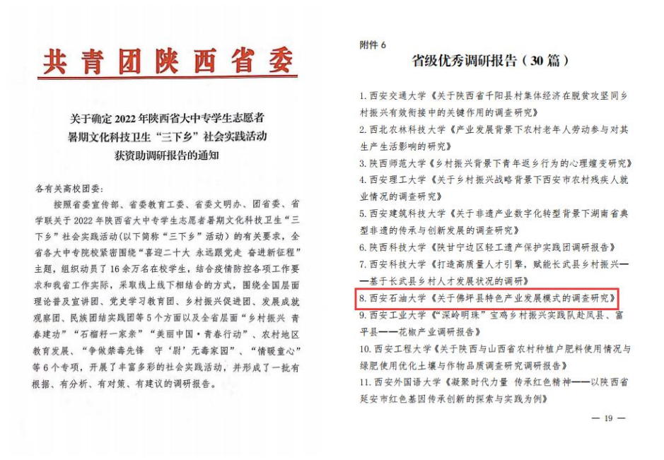 近日,由陕西省委宣传部、省委文明办、省委教育工委、团省委、省学联等单位联合组织开展的“2022年陕西省大中专学生志愿者暑期文化科技卫生‘三下乡’社会实践活动”评选表彰结果揭晓,bat365荣获2022年“三下乡”活动省级优秀组织单位,地球科学与工程学院“十心石意援乡助农”社会实践队,电子工程学院“曦禾下乡”社会实践队被评为省级优秀团队。王莹、李政被评为省级先进个人。地球科学与工程学院《关于佛坪县特色产业发展模式的调查研究》调研报告获团省委专项资助。