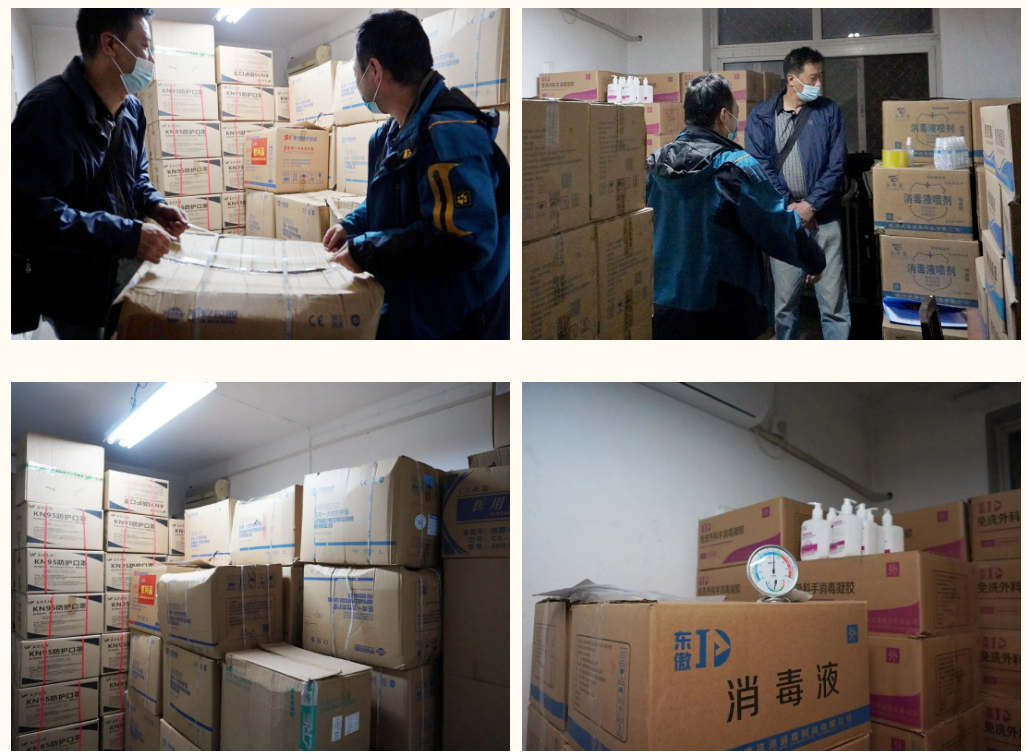 在物资储备现场,国资处工作人员加班加点将采购好的口罩、消毒液等防疫物资清点入库,并做好细致的安全检查,确保物资保障不掉线。