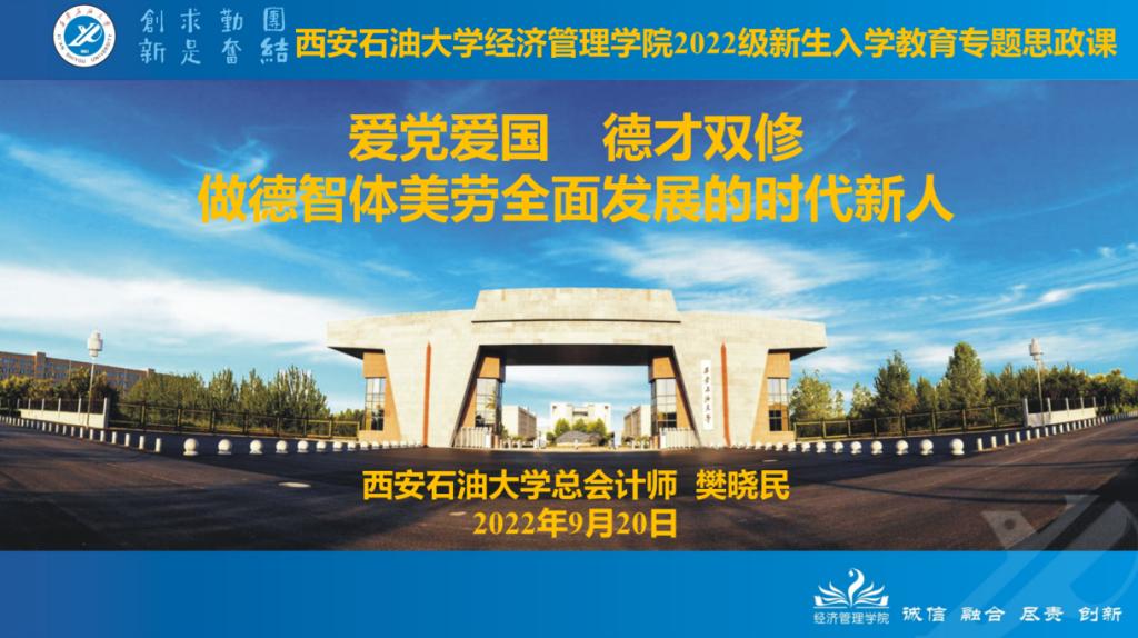 为帮助新生入学后尽快融入校园环境、积极面对大学生活、全身心投入专业学习,顺利实现角色转变,引导学生努力成长为社会主义合格建设者和可靠接班人而奋斗,9月20日,总会计师樊晓民以《爱党爱国,德才双修,做德智体美劳全面发展的时代新人》为题,围绕文化知识教育、爱国主义教育、思想品德教育和理想信念教育等方面内容,用深入浅出的理论讲解、图文并茂的案例分析和生动形象的个人经历为经济管理学院2022级新生讲授专题思政课。