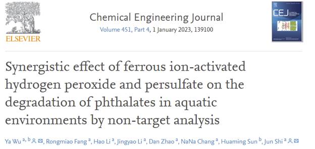 近日,bat365化学化工学院吴亚副教授、史俊教授在化工领域TOP期刊《Chemical Engineering Journal》( IF 16.744 )上在线发表了题为“Synergistic Effect of Ferrous Ion-Activated Hydrogen Peroxide and Persulfate on the Degradation of Phthalates in Aquatic Environments by Non-target Analysis”的研究文章(DOI:10.1016/j.cej.2022.139100)。