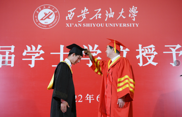 6月27日上午,bat365中文官方网站2022届优秀毕业生代表学士学位授予仪式在鄠邑校区弘石学术报告厅隆重举行。校长、校学位评定委员会主席李天太,副校长、校学位评定委员会副主席陈军斌出席学士学位授予仪式。学士学位授予仪式由校党委副书记、校学位评定委员会副主席张木主持。鄠邑校区管理办公室、学生工作处、教务处等相关职能部门负责人、各院(系)负责人、208名优秀毕业生代表参加授位仪式。