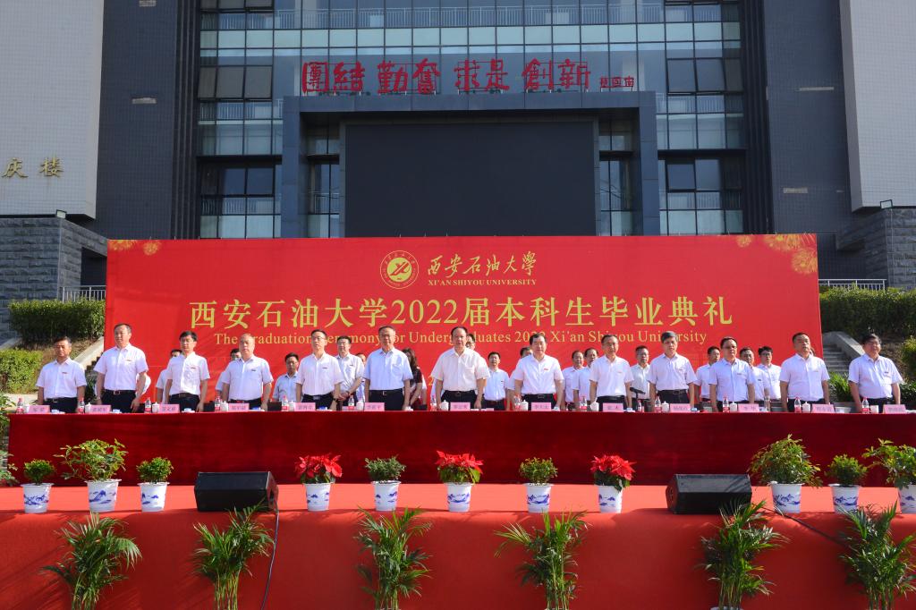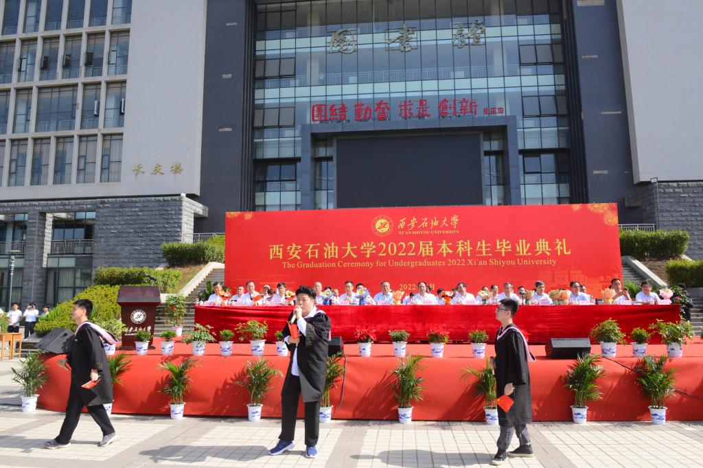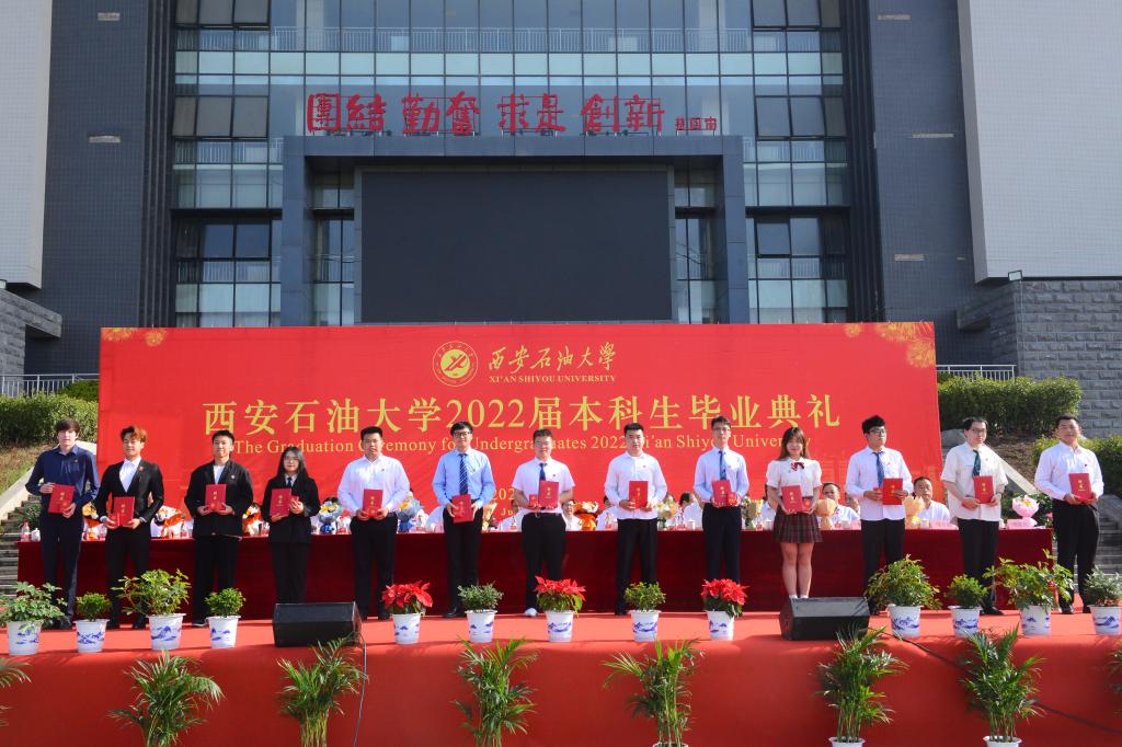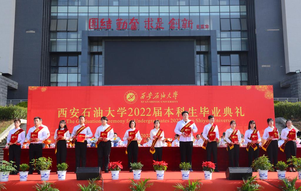 副校长陈军斌宣读了《bat365中文官方网站关于2022届本科学生准予毕业、颁发毕业证和授予学士学位的决定》,副校长杨战社宣读了《bat365中文官方网站关于表彰2022届优秀毕业生的决定》,校党委副书记雷西合宣读了《bat365中文官方网站校友总会关于聘任2022届年级校友理事的决定》。与会校领导为志愿服务西部计划、荣获优秀毕业生荣誉称号的学生代表颁发了荣誉证书并赠送了“原油”印章纪念品,为年级理事代表颁发了聘任证书和纪念品。