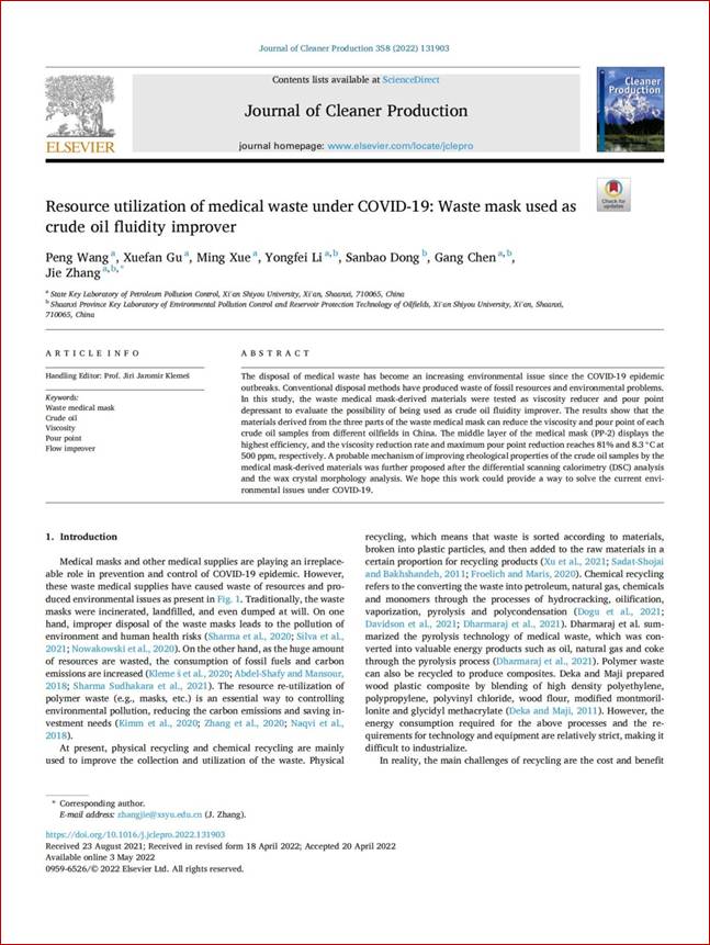 该项研究工作近期以“Resource utilization of medical waste under COVID-19: Waste mask used as crude oil fluidity improver”为题发表在Journal of Cleaner Production(中科院一区,TOP期刊,2021年IF=9.297)期刊上。张洁教授和顾雪凡教授共同指导,硕士研究生王棚为论文第一作者,张洁教授为通讯作者,bat365中文官方网站为第一单位。