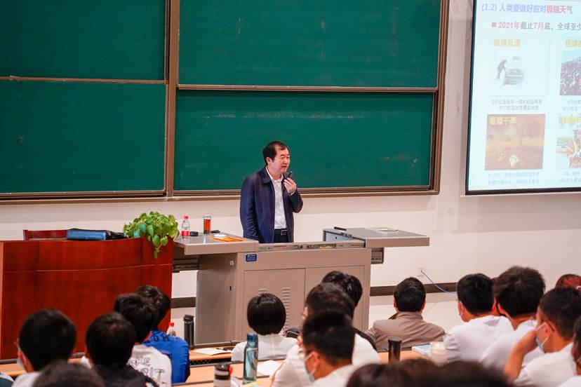 在授课中,李天太首先围绕“双碳目标”和习近平总书记对统筹有序做好碳达峰、碳中和工作的多次指示,向同学们介绍了全球环境事件动态,阐释了加快碳减排是大势所趋。随后分别介绍了世界油气发展趋势和我国油气发展趋势。他以地球演化为切入点,从“能源科技革命”“世界能源新格局”“世界油气工业”“世界天然气工业”“一次能源消费结构变化”等六个方面阐述了世界油气发展趋势。又以油气是国家重要战略资源为切入点,从“新中国石油进出口史”“中国含油气盆地分布”“我国石油进口海上通道”等七个方面阐述了我国油气发展趋势。最后,李天太结合自己的工作学习感悟,对新能源发展趋势做出展望,对地科学子的学习生活作了指导和要求。他强调,我们要积极推动我国能源生产与消费革命,坚持“四个革命 、 一个合作”,不断勤奋学习,刻苦钻研,要面向世界科技前沿、面向经济主战场、面向国家重大需求、面向人民生命健康作出科技创新。他希望大家要牢记习近平总书记的嘱托,在日常学习生活中要爱党爱国爱民,要锤炼品德、勇于创新、实学实干。