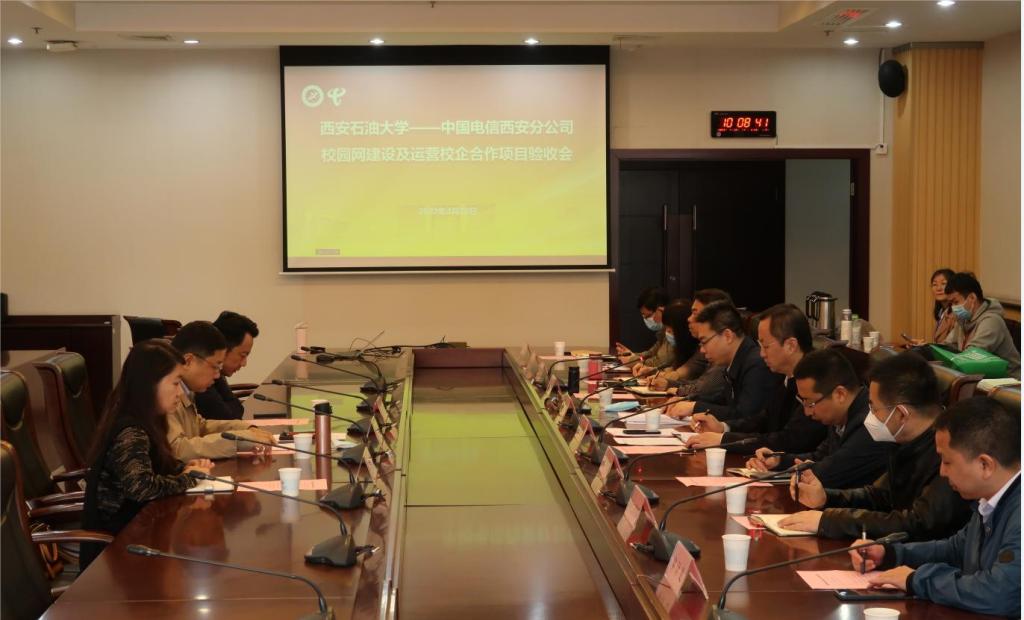4月28日上午,学校在鄠邑校区图书馆第二会议室召开“bat365中文官方网站—中国电信股份有限公司西安分公司 校园网建设及运营校企合作项目”验收会。学校网络安全与信息化工作领导小组副组长、副校长张荣军,中国电信股份有限公司西安分公司副总经理杨帆出席会议,学校党政办公室、学生工作部(处)、保卫部(处)、审计处、财务处、国有资产处、资产经营处、基建处、后勤处等学校网络安全与信息化工作领导小组成员单位负责人以及西安电信校园运营中心总经理王建成、总监杨莎莎参加会议,会议由信息中心主任王学龙主持。