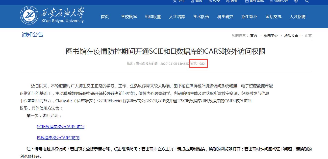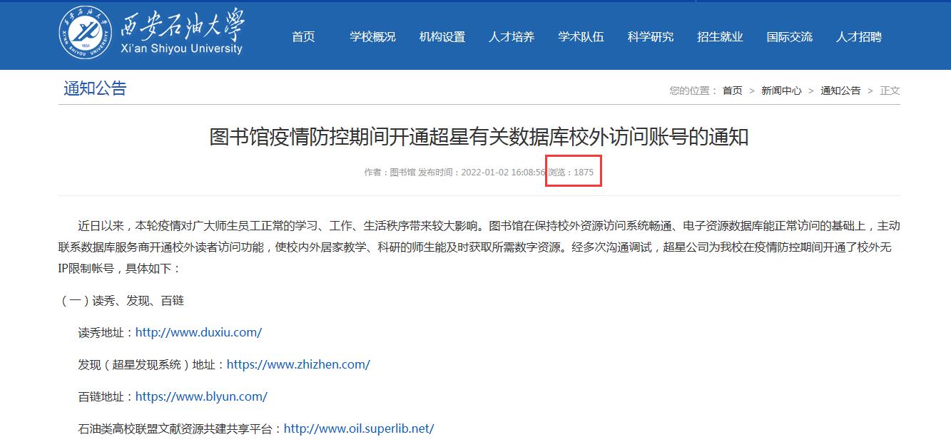 疫情发生后,广大教职工居家办公,在校外居住的教职工不能顺畅地使用各种学术资源。基于此,图书馆进一步加强网络技术支持,确保校外资源访问系统畅通,电子资源数据库正常访问,使移动图书馆保持24小时全天候服务。在此基础上,图书馆主动联系数据库服务商,开通了5个数据库商的校外访问功能和18个数据库的试用功能,使校内外居家学习工作的师生能及时获取所需数字资源。为确保访问质量,前期邀请了多位校外居住老师及学校科研qq群的老师参与测试,经过反复调试确认后正式开通。已开通的校外访问数据库包括了目前使用最广、最权威的中英文数据库。其中,中文数据库有:中国知网期刊数据库、中国知网学位论文数据库、中国知网全球学术快报APP、超星读秀、超星百链、超星发现、超星学术视频资源及掌阅精选数字阅读平台、中国知网试用数据库等;英文数据库有:SCIE数据库、EI数据库、Springer数据库等。