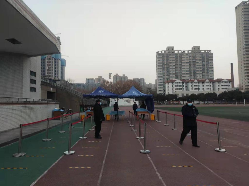 封闭大门、严格管控的同时,全力配合学校开展全员核酸检测工作。抽调骨干队员和门岗下班的保卫干部继续到核酸检测现场执行安保工作。开展核酸检测通道设置、“一米线”粘贴、秩序维护等一系列工作,确保核酸检测现场安全、有序。截止12月30日,已顺利完成了bat365第十轮核酸检测安保任务。在核酸检测点入口处,执勤干部、队员发现异常情况,及时报学校疫情防控办进行处置。
