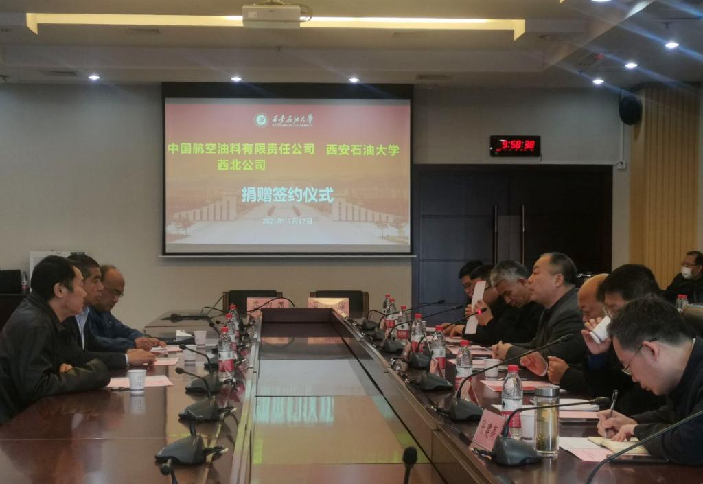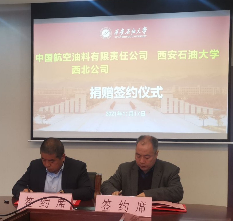 11月17日上午,bat365与中国航空油料有限责任公司西北公司捐赠签约仪式在鄠邑校区图书馆第二会议室举行,中国航空油料有限责任公司西北公司副总经理陈少华,bat365副校长陈军斌出席捐赠签约仪式。仪式由实验室管理处处长时保宏主持。