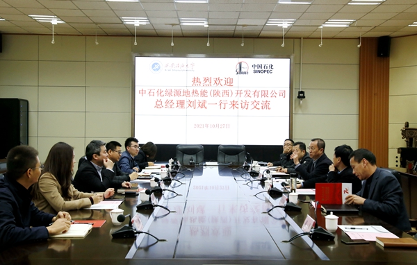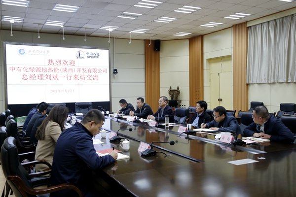 10月27日上午,中石化绿源地热能(陕西)开发有限公司总经理刘斌一行6人来校交流座谈。会议在雁塔校区会议中心第二会议室召开。副校长杨战社出席会议,科技处、基建处、后勤管理处和石油工程学院负责人参加了会议。副校长张荣军主持会议。