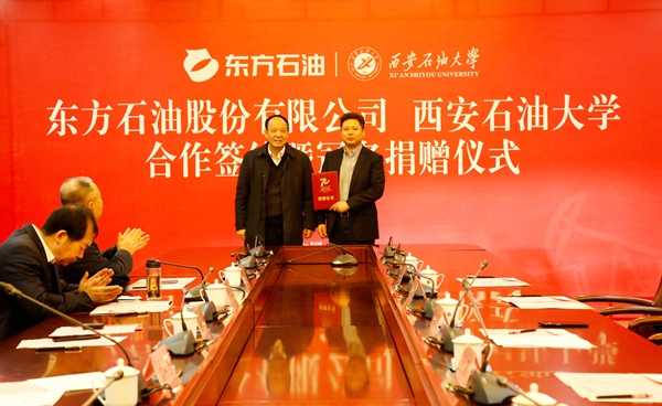 刘浩董事长介绍了东方石油股份有限公司的发展历程、主营业务、战略市场等基本情况。并回顾了自己在母校的求学历程,真诚地表达了对母校培养和老师的谆谆教诲的感激之情。他谈到,回到母校深切感受到了学校的发展建设与改革变化,作为校友深受鼓舞。在母校建校七十周年之际,能为母校的事业发展作一点力所能及的微薄贡献,感恩母校、回报母校,是每一位西石大学子内心的共同愿望。希望以此次合作签约为契机,双方能够在助学奖教、人才培养,技术攻关等多方面进行深入合作,促进双方互利共赢、共同发展,衷心祝愿母校的事业发展更加辉煌。