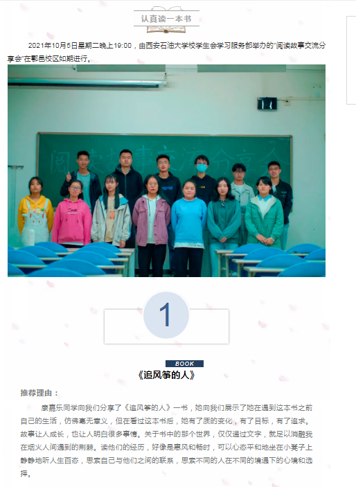 校学生会微信公共号推送《阅读,成为一生的功课!——校学生会阅读故事交流分享会》,通过对国庆假期开展的“阅读故事交流分享会”成果进行展示,进一步倡议广大青年学子从经典名著中感悟人生哲理,坚定理想信念。