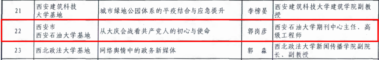 今年7月,为持续深化习近平新时代中国特色社会主义思想学习教育,进一步加强干部教育培训教材课程建设,加快推进优质培训资源共享,提高干部教育培训针对性有效性,西安市委组织部下发《关于开展全市干部教育培训精品课暨好课程评选工作的通知》。根据市委组织部对课程推荐范围和类别的要求,在课程的选择上,bat365干部教育培训基地以大庆精神、铁人精神为主线,结合课堂效果和满意度调查结果,推荐了课堂效果好、学员满意度高、石油特色鲜明,由期刊中心郭岗彦主任主讲的《从大庆会战看共产党人的初心与使命》课程参加评选。郭岗彦主任精心准备,于7月29日参加西安市委组织部组织的参评课程评审会,经过现场授课,通过了专家盲评,入围全省精品课程评选范围。