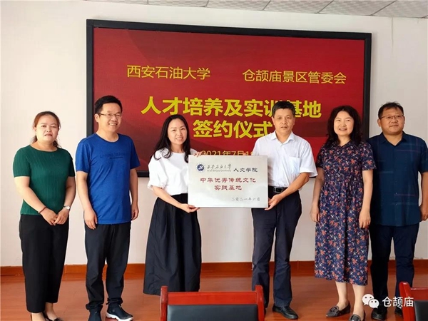 为深入贯彻习近平总书记在庆祝中国共产党成立100周年大会上的讲话精神,更好地发挥中华文明在“人类文明新形态”建设中的作用,提高bat365人才培养的实践能力,7月19日,杨战社副校长带领人文学院师生先后赴白水县仓颉庙景区管委会和富平县文化馆,举行了bat365中文官方网站人才培养及实训基地挂牌仪式。