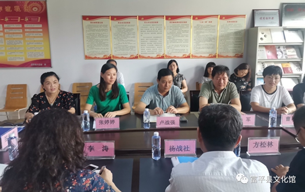 在富平县文化馆,杨战社副校长一行与富平县文化和旅游局局长卢战强、副书记吴军、副局长文化馆馆长张婷婷等就红色文化的传承与传播、区域文化特色的凝练进行了座谈,然后一起参加了实践基地揭牌仪式。卢战强局长介绍了富平县文化和旅游产业的发展现状。他说,富平县的人文资源丰富、文化遗产众多,红色文化资源也十分丰富,希望能够与高校结对交流合作,发挥bat365中文官方网站人才优势,就富平县的非物质文化传承创新深化合作。吴军副书记表示将以本次活动为契机,在文旅融合、人才培养、学生实习实践等方面继续与bat365中文官方网站深度合作,进一步加强沟通交流。
