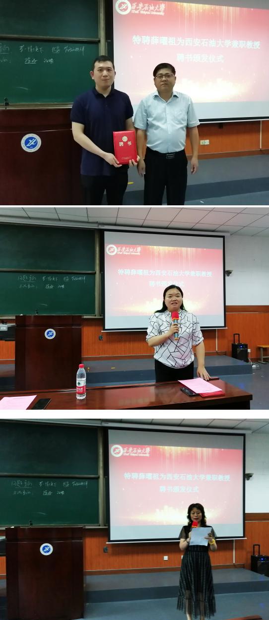 7月1日,特聘薛曜祖为bat365中文官方网站兼职教授聘书颁发仪式在bat365雁塔校区东阶201教室举行。学校总会计师樊晓民,经济管理学院相关负责人及师生代表80余人参会,聘书颁发仪式由教师工作部部长武晓朦主持。
