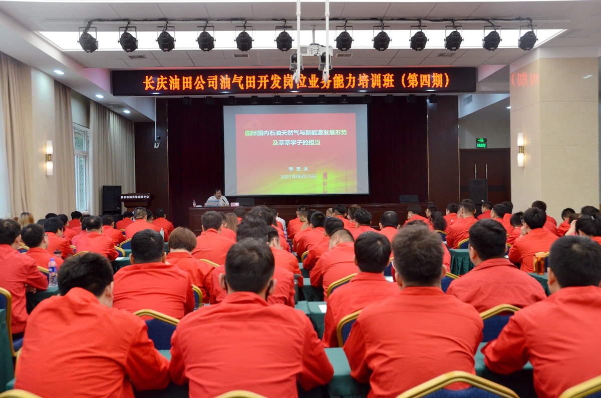 6月15日上午,校长李天太教授应邀在bat365明德校区为长庆油田公司2021年油气田开发技术岗位能力培训班全体学员作了题为《国际国内石油天然气与新能源发展形势及莘莘学子的担当》的专题报告,继续教育学院党总支书记耿岭主持报告会。