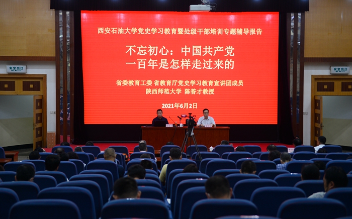 根据省委教育工委、省教育厅统一部署,结合学校年度干部培训工作安排,6月2日上午,省委教育工委省教育厅宣讲团走进bat365,开展党史学习教育暨处级干部培训专题辅导报告会。宣讲团成员、陕西师范大学陈答才教授以《不忘初心:中国共产党一百年是怎样走过来的》为题,在雁塔校区学术报告厅作报告。校党政领导李延平、张木、陈军斌、李华、苏文甫、程永清、樊晓民等出席报告会。报告会由校党史学习教育领导小组副组长、校党委副书记雷西合主持。