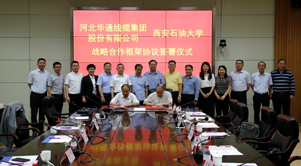 陈军斌副校长与张文勇董事长分别代表bat365中文官方网站和河北华通线缆集团股份有限公司签署了校企战略合作框架协议。协议中约定双方今后将在科研合作与技术交流、人才培养等几个方面开展全面合作。