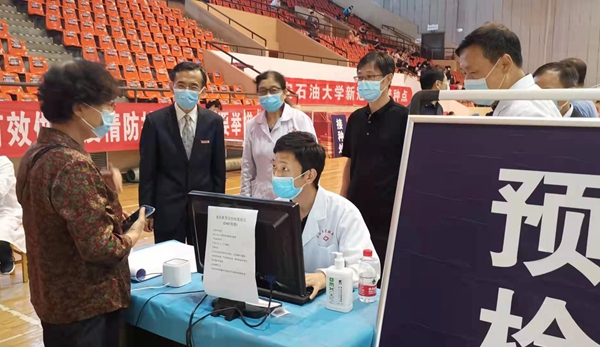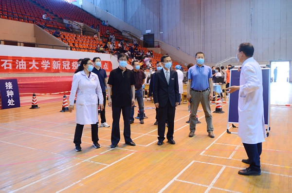 校党委副书记张木、副校长苏文甫在疫苗接种现场,听取了疫苗接种工作有关情况汇报,详细询问了预约接种流程安排,看望慰问正在进行疫苗接种的工作人员和师生。