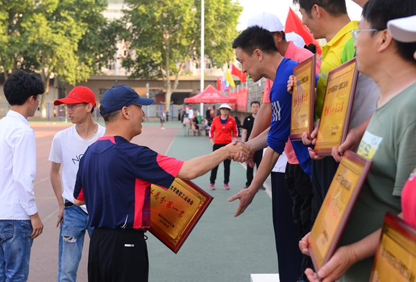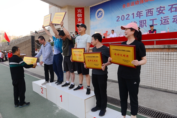 雷西合副书记为荣获本届运动会团体总分前六名的代表队颁奖,分别是:机关七代表队与体育系代表队(并列)、石油工程学院代表队、经济管理学院代表队、人文学院代表队、地球科学与工程学院代表队、机关二代表队。