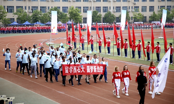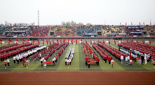 上午8点30分,伴随着铿锵有力的运动员进行曲,国旗、校旗、会徽队,裁判员方阵和13支参赛代表队有序通过主席台接受检阅。入场仪式上,bat365师生精神抖擞、生气勃勃,展现了奋勇进取的精神面貌。各个方阵途经主席台时,纷纷表达了对建党100周年、建校70周年的美好祝愿,表示了要用健康与智慧担当起新时代责任的决心。