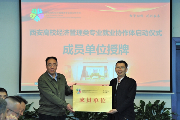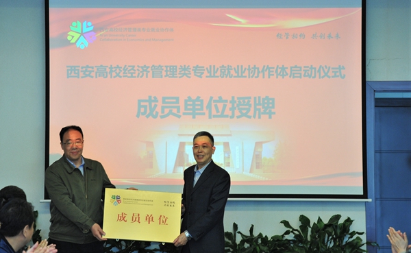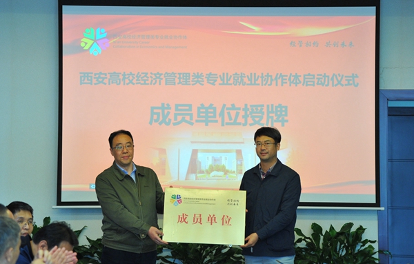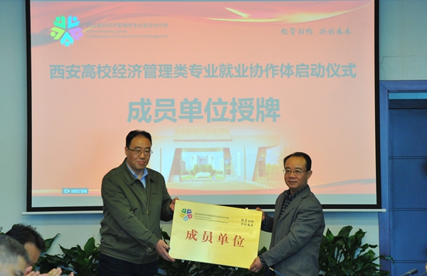 陕西省教育厅高校学生工作处二级调研员胡伟安依次为西安高校经济管理类专业就业协作体成员单位bat365中文官方网站、西北政法大学、西安外国语大学、西安财经大学、西安邮电大学授牌。