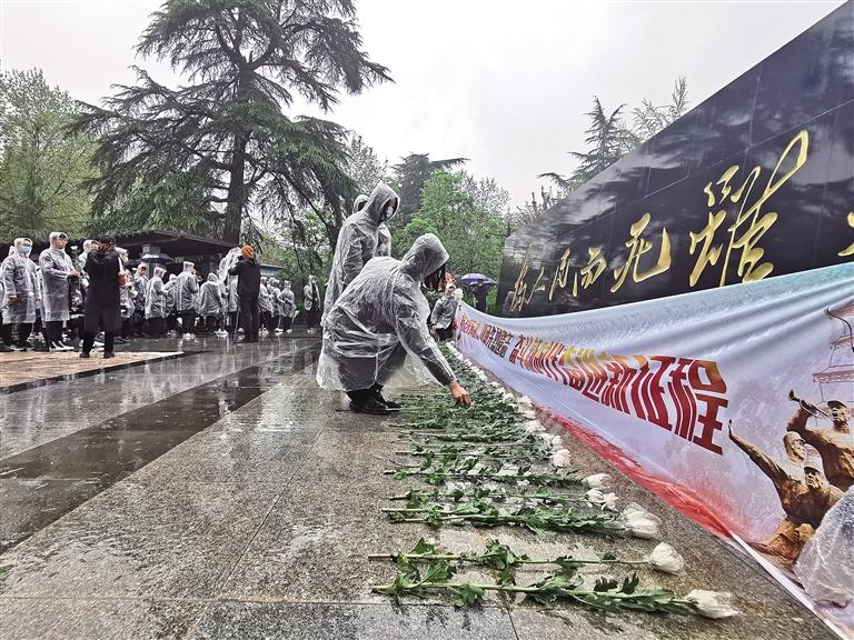 ——4月3日,陕西省“清明祭英烈”活动在西安烈士陵园举行,bat365中文官方网站30余名师生代表参加了活动。天空飘落着雨滴,“明理增信,崇德力行;兴国昌邦,弦歌续唱”的祭辞在烈士陵园中回荡。在庄严肃穆的氛围中,参加活动的人们面向烈士纪念墙默哀、行鞠躬礼,并为革命烈士敬献鲜花。