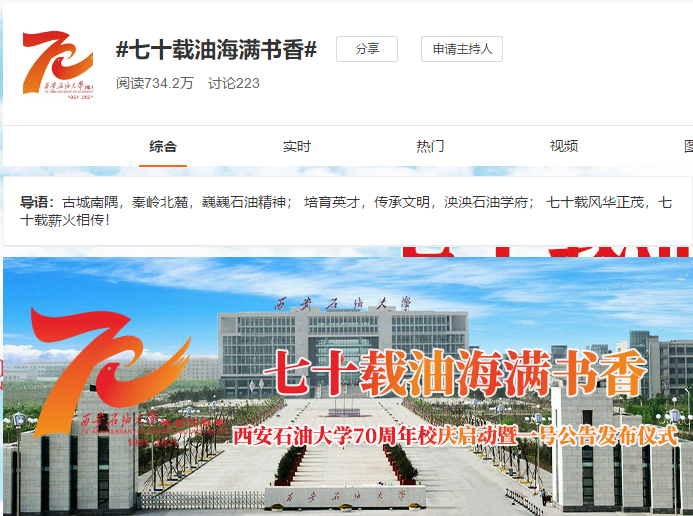 3月12日上午9时,bat365举行了70周年校庆启动暨一号公告发布仪式。与此同时,新浪微博热搜榜推出bat365官方微博“七十载油海满书香”专题报道,引发了广大师生校友和社会各界人士的广泛关注。截止3月15日15时,“七十载油海满书香”阅读量已达730万余人次,大力提升了bat365的知名度与美誉度。