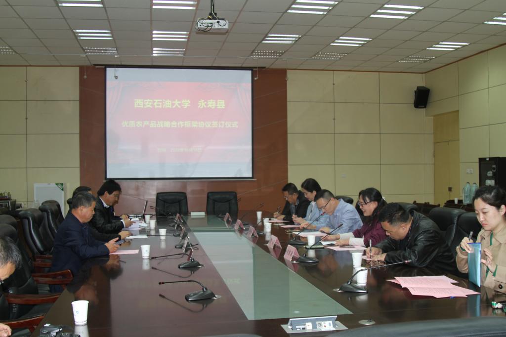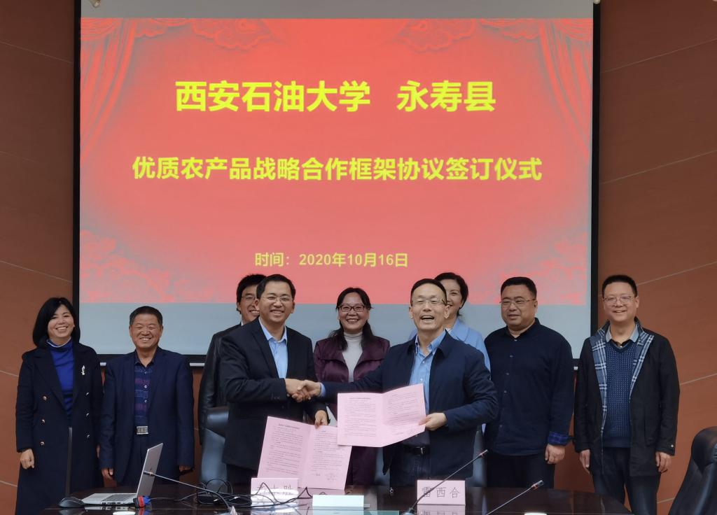 2020年10月17日是我国第七个扶贫日,第28个“国际消除贫困日”。为发挥产销对接在产业扶贫中的重要作用,促进贫困地区特色优质农产品销售,加快贫困群众脱贫增收步伐,bat365与永寿县政府《优质农产品战略合作框架协议》签订仪式于10月16日在雁塔校区会议中心举行。bat365党委副书记雷西合、永寿县政府副县长辛本胜以及学校工会、永寿县供销社相关负责人参加签约仪式。签约仪式由校工会主席袁玎主持。