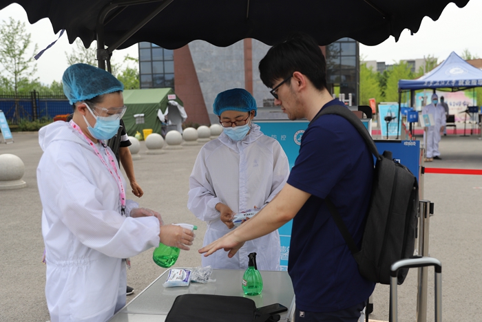 返校当天,所有同学在现场工作人员的指引下,依次有序完成了更换口罩、测量体温、行李消毒、健康码核查、身份核实等流程。